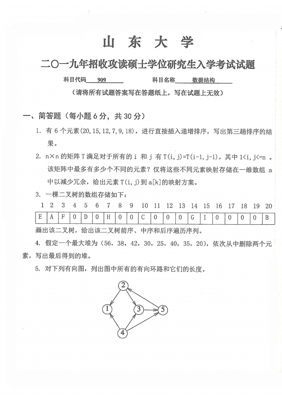 山东大学2019年909数据结构考研真题