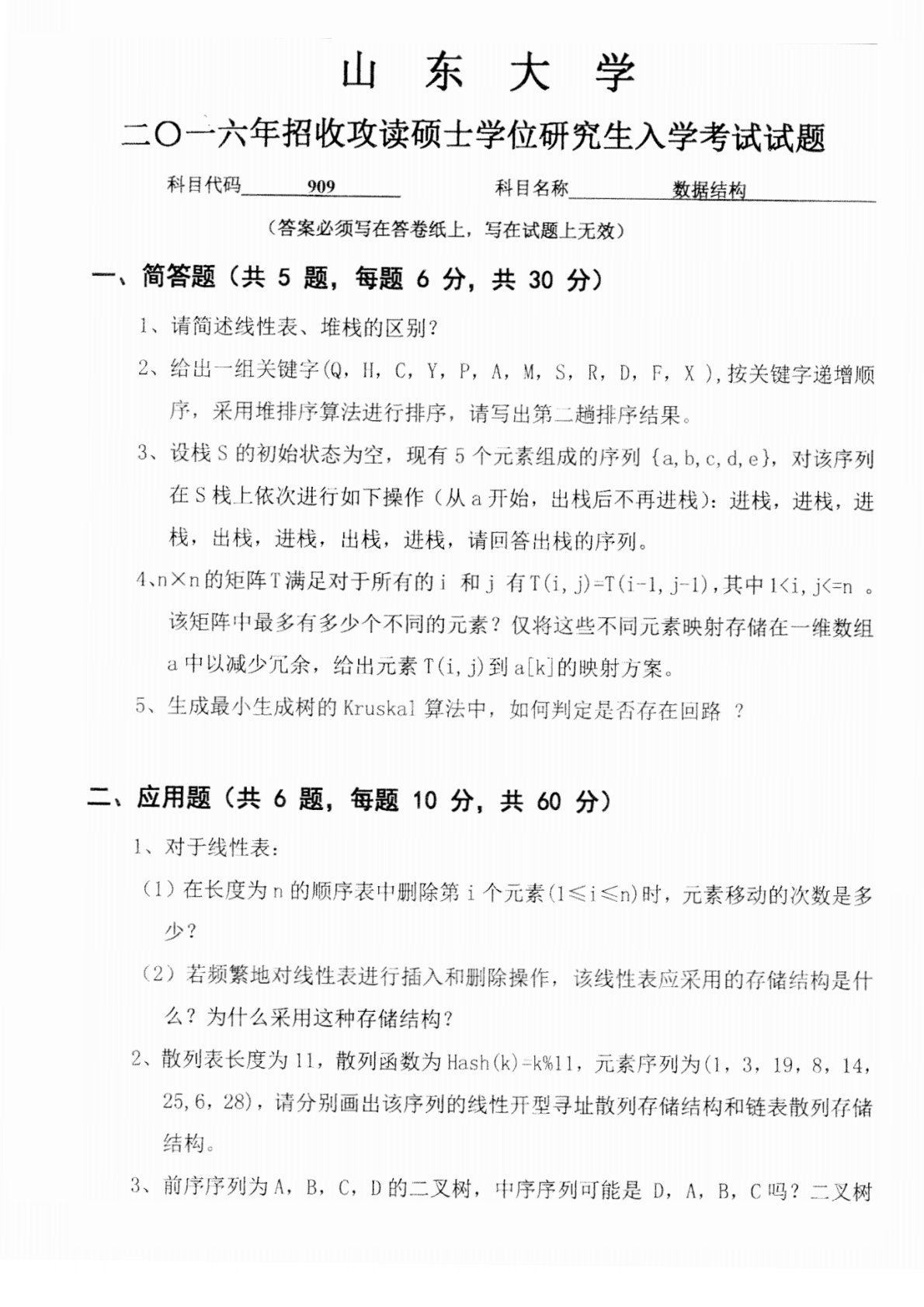 山东大学2016年909数据结构考研真题