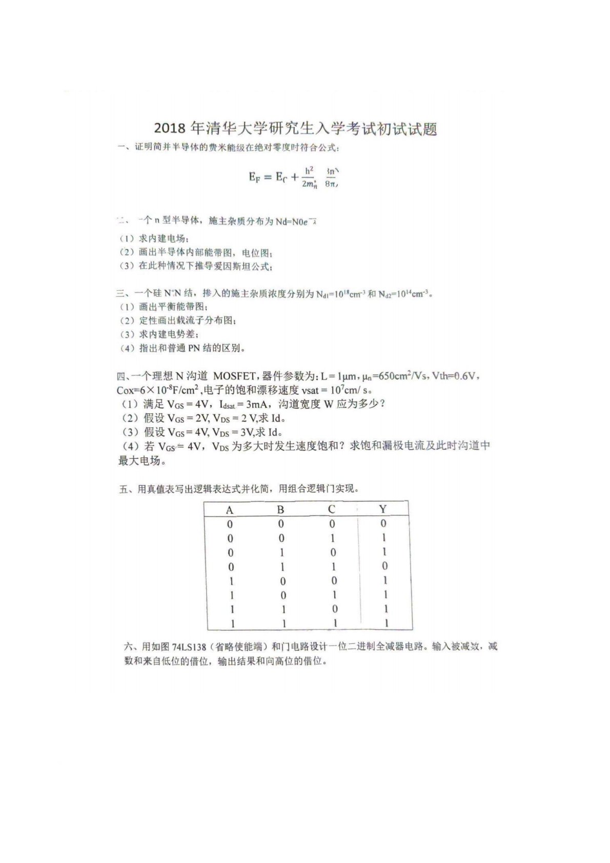 清华大学832半导体器件与电子电路2018年真题