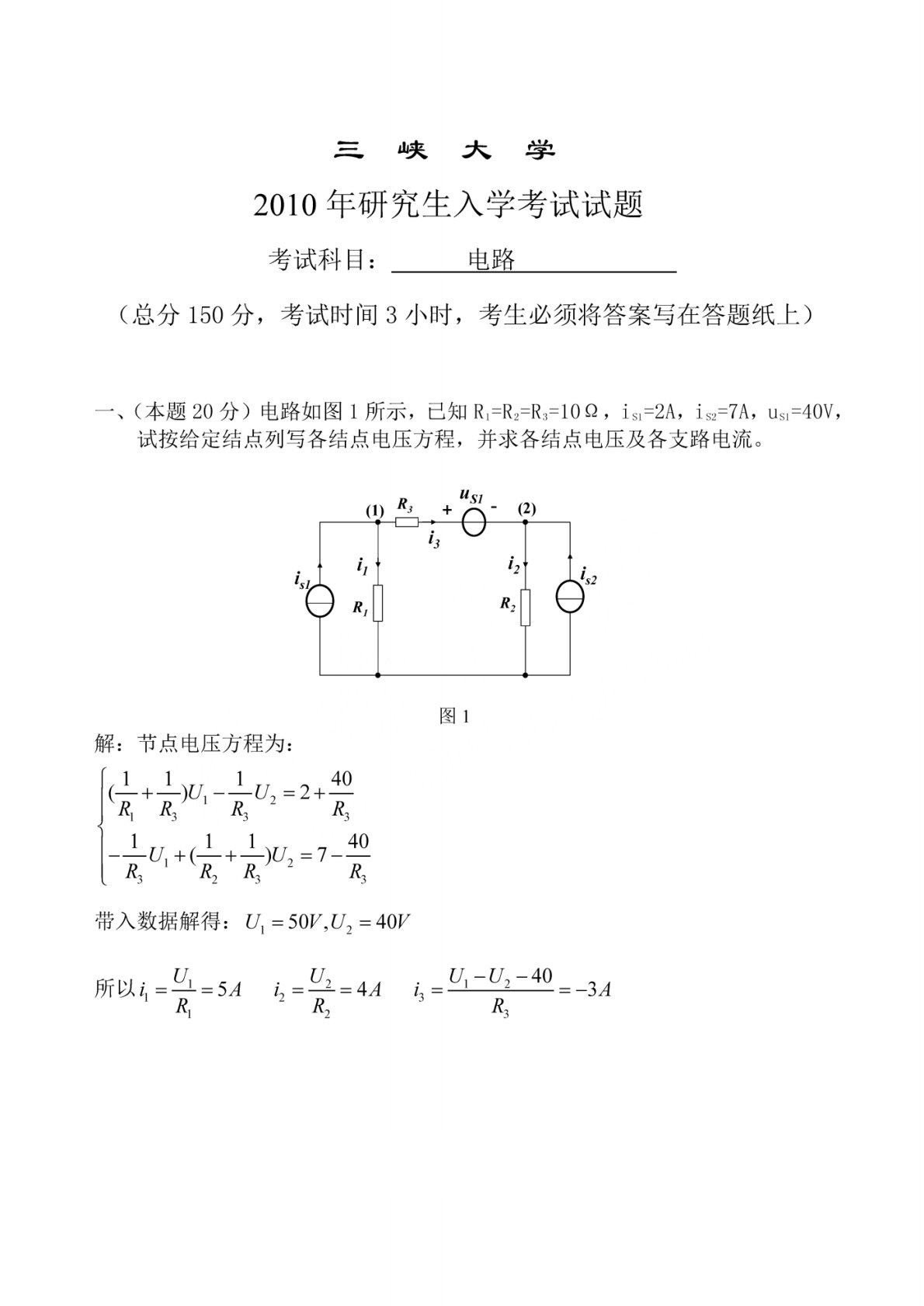 三峡大学831电路2010年真题答案
