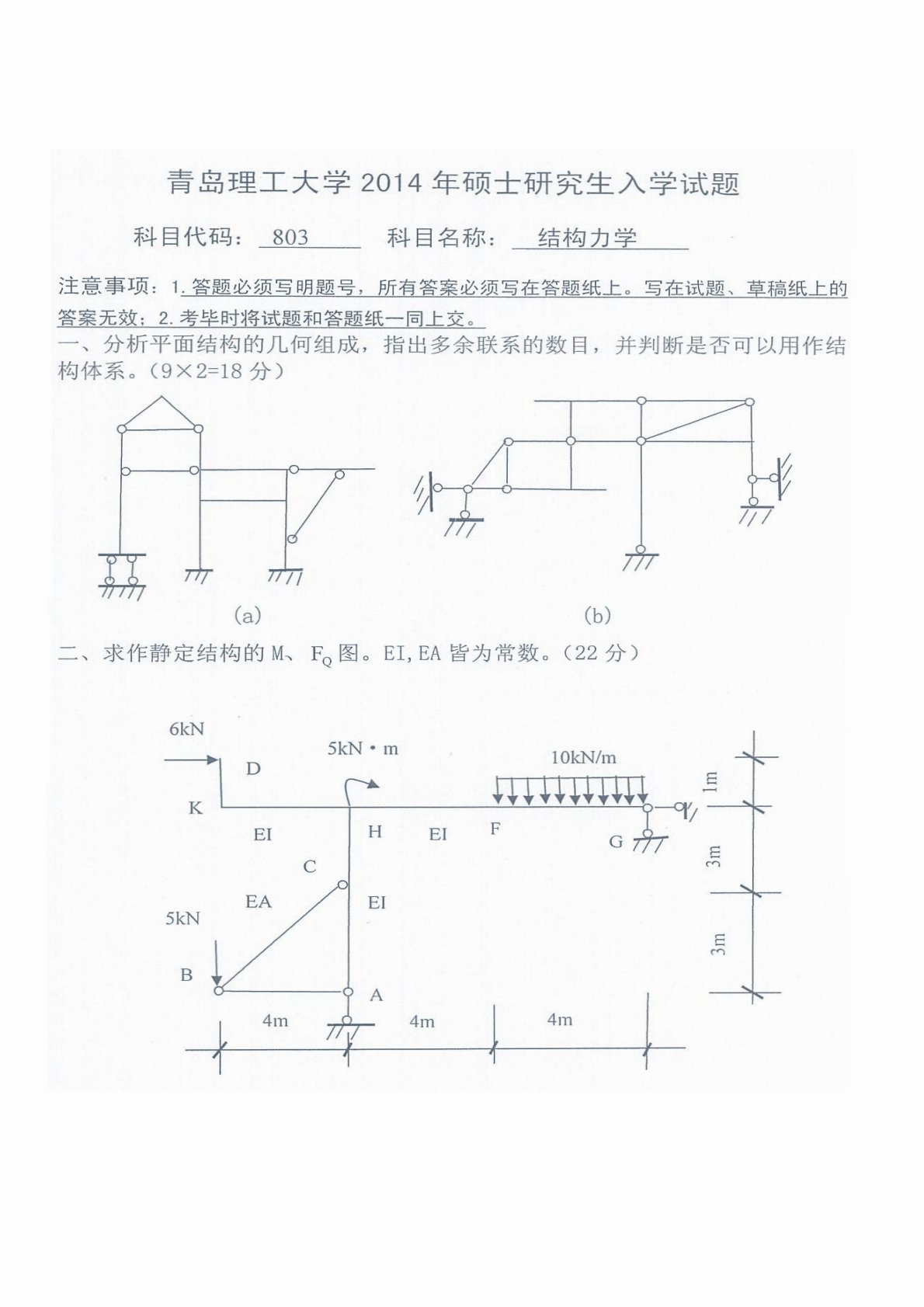 青岛理工大学803结构力学2014年真题