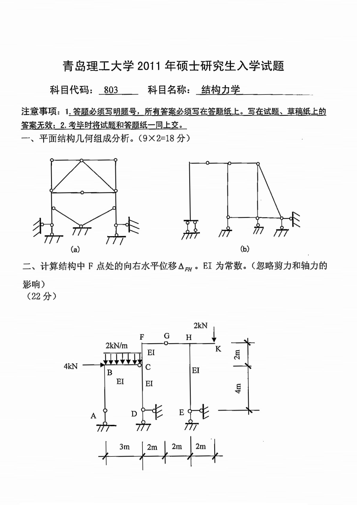 青岛理工大学803结构力学2011年真题