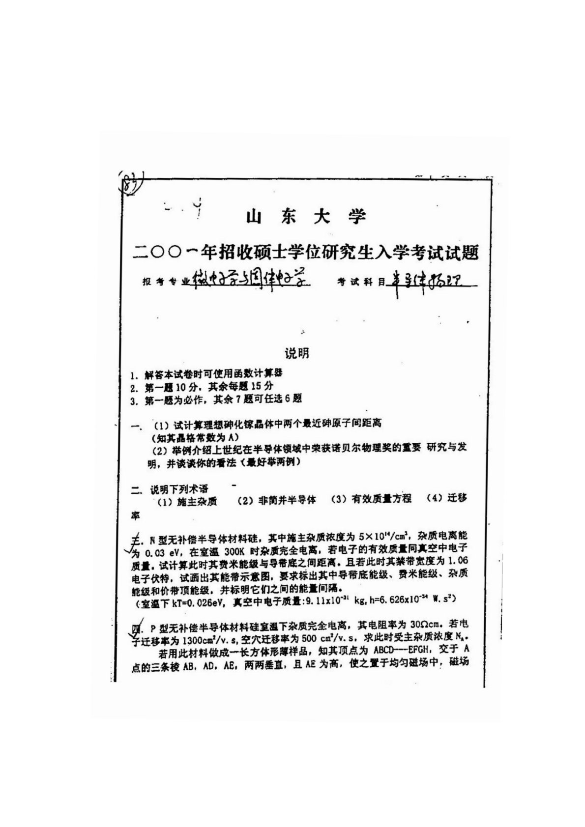 山东大学830半导体物理2001年真题
