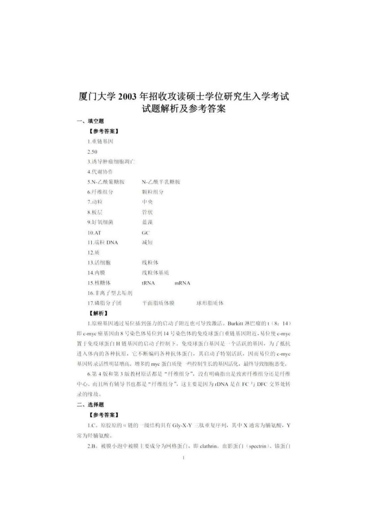 厦门大学831分子细胞生物学2003年真题答案