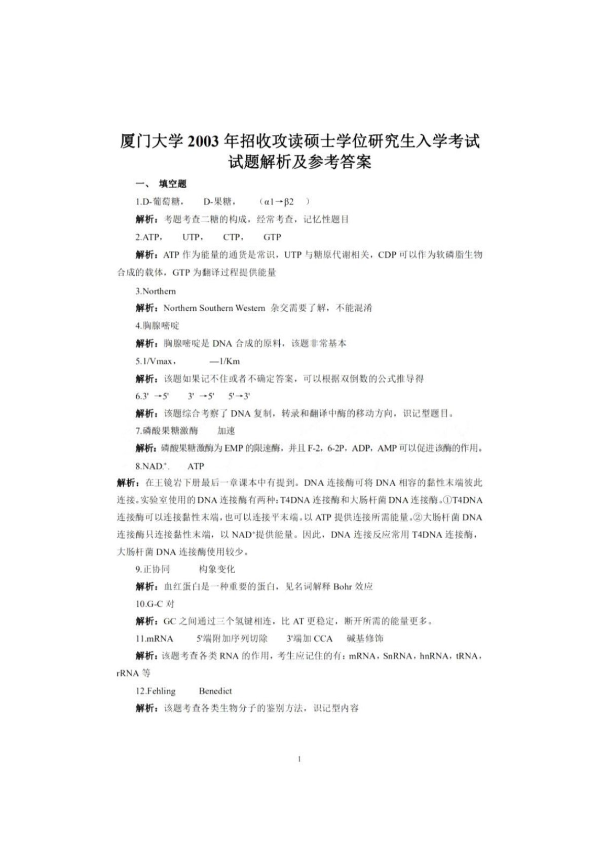 厦门大学338生物化学2003年真题答案