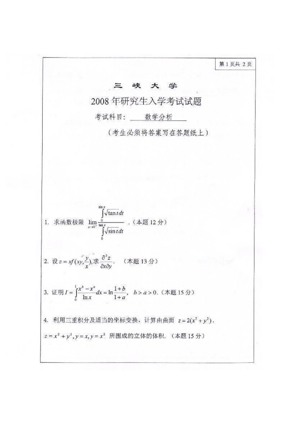 三峡大学771数学分析2008年真题