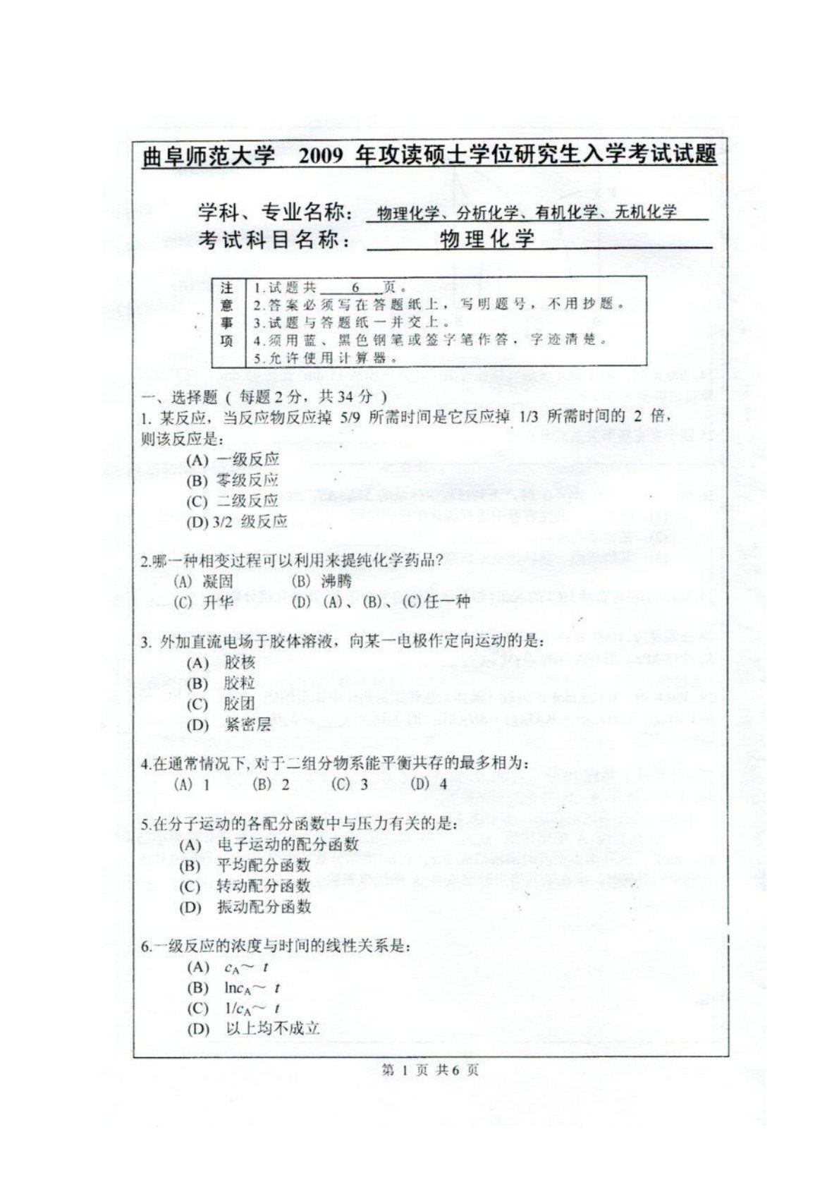 曲阜师范大学872物理化学(专硕)2009年真题