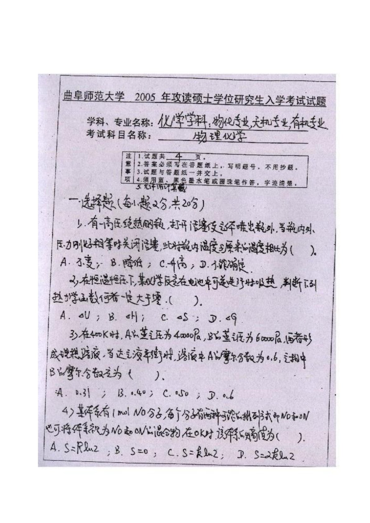曲阜师范大学872物理化学(专硕)2005年真题手写版