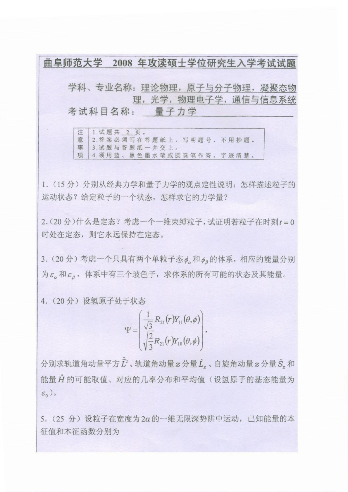 曲阜师范大学851量子力学(学硕)2008年真题
