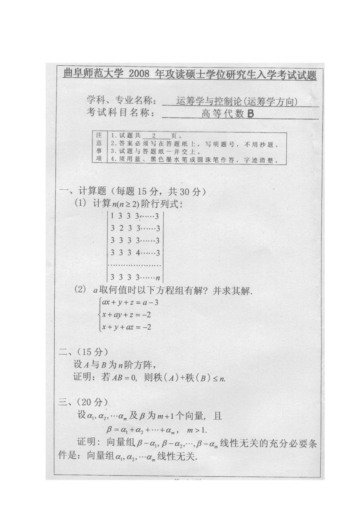 曲阜师范大学850高等代数A(学硕)2008年真题