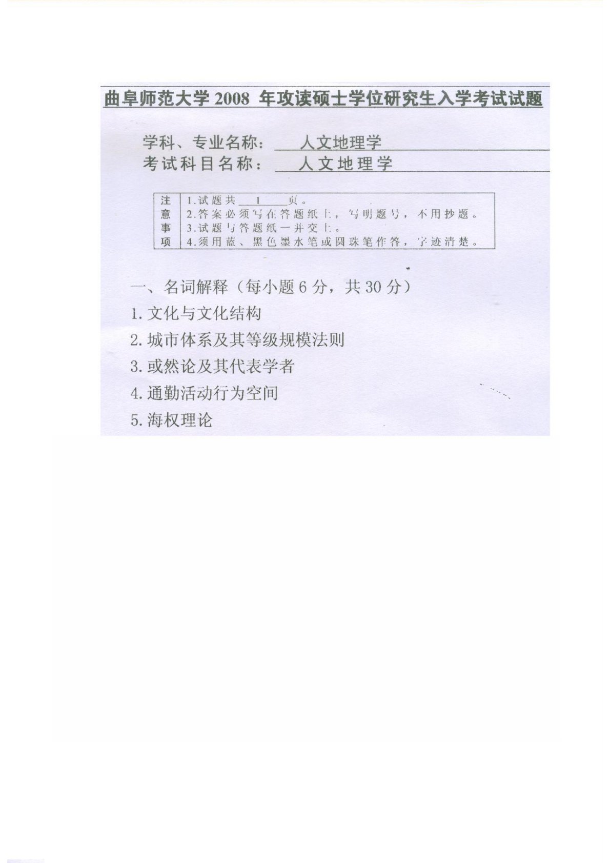 曲阜师范大学763人文地理学(专硕)2008年真题