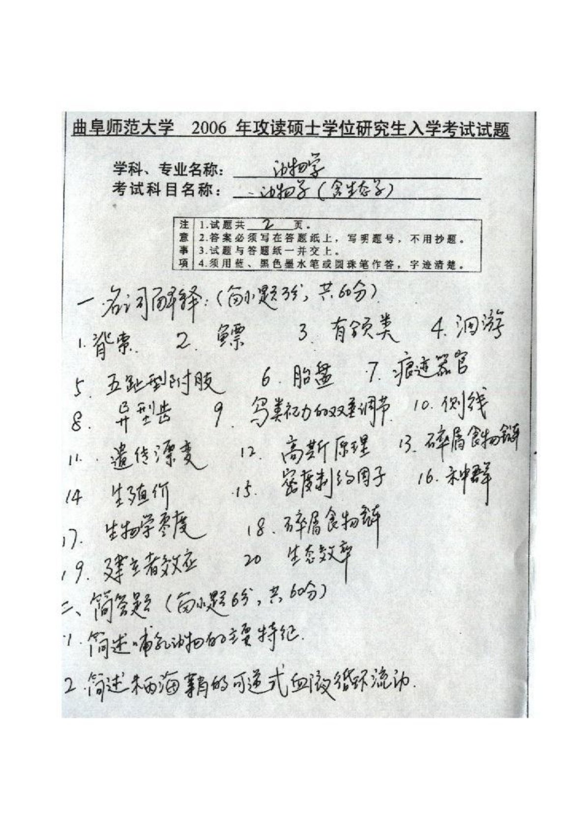 曲阜师范大学761生态学(学硕)2006年真题手写版