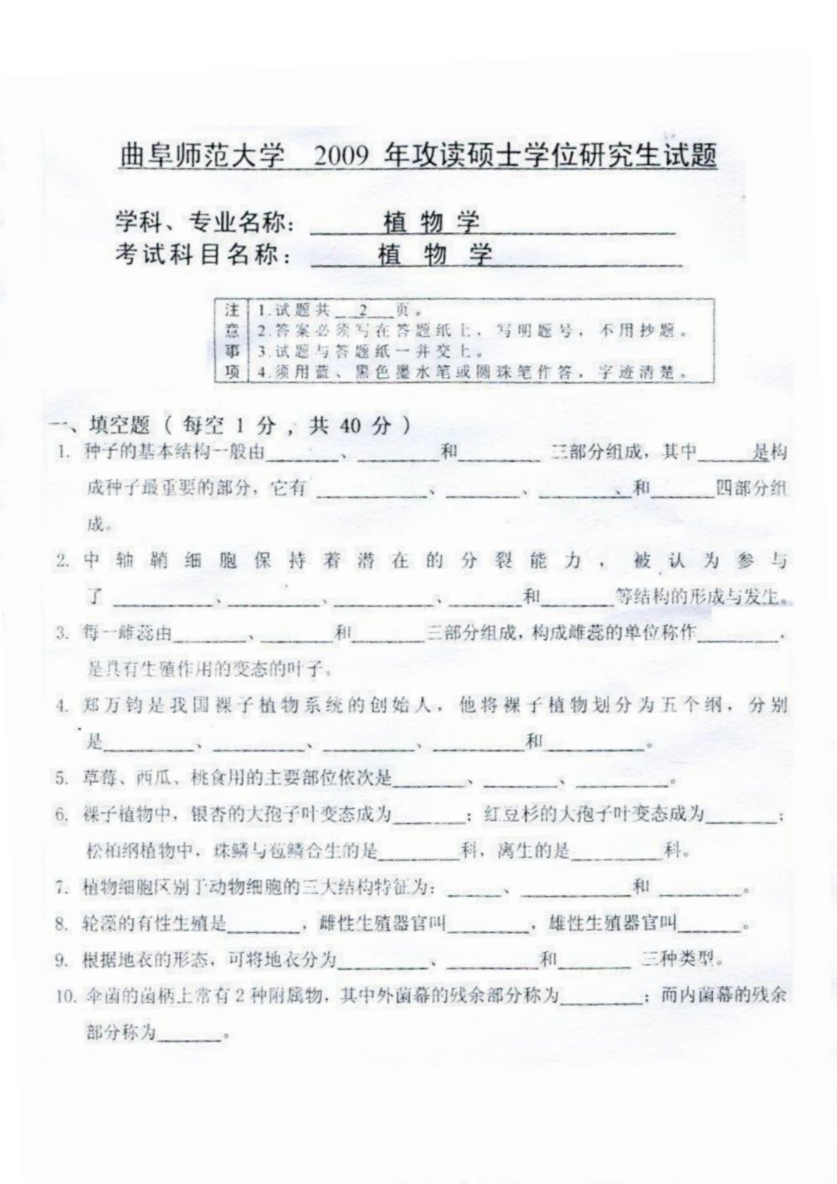 曲阜师范大学759基础生物学(植物学形态解剖、动物学脊椎动物)(学硕)2009年真题