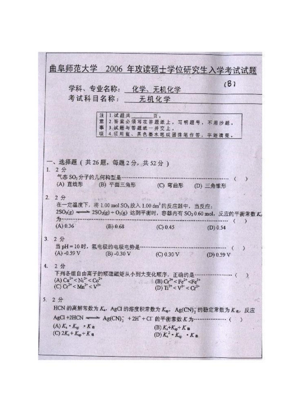 曲阜师范大学753无机化学(学硕)2006年真题