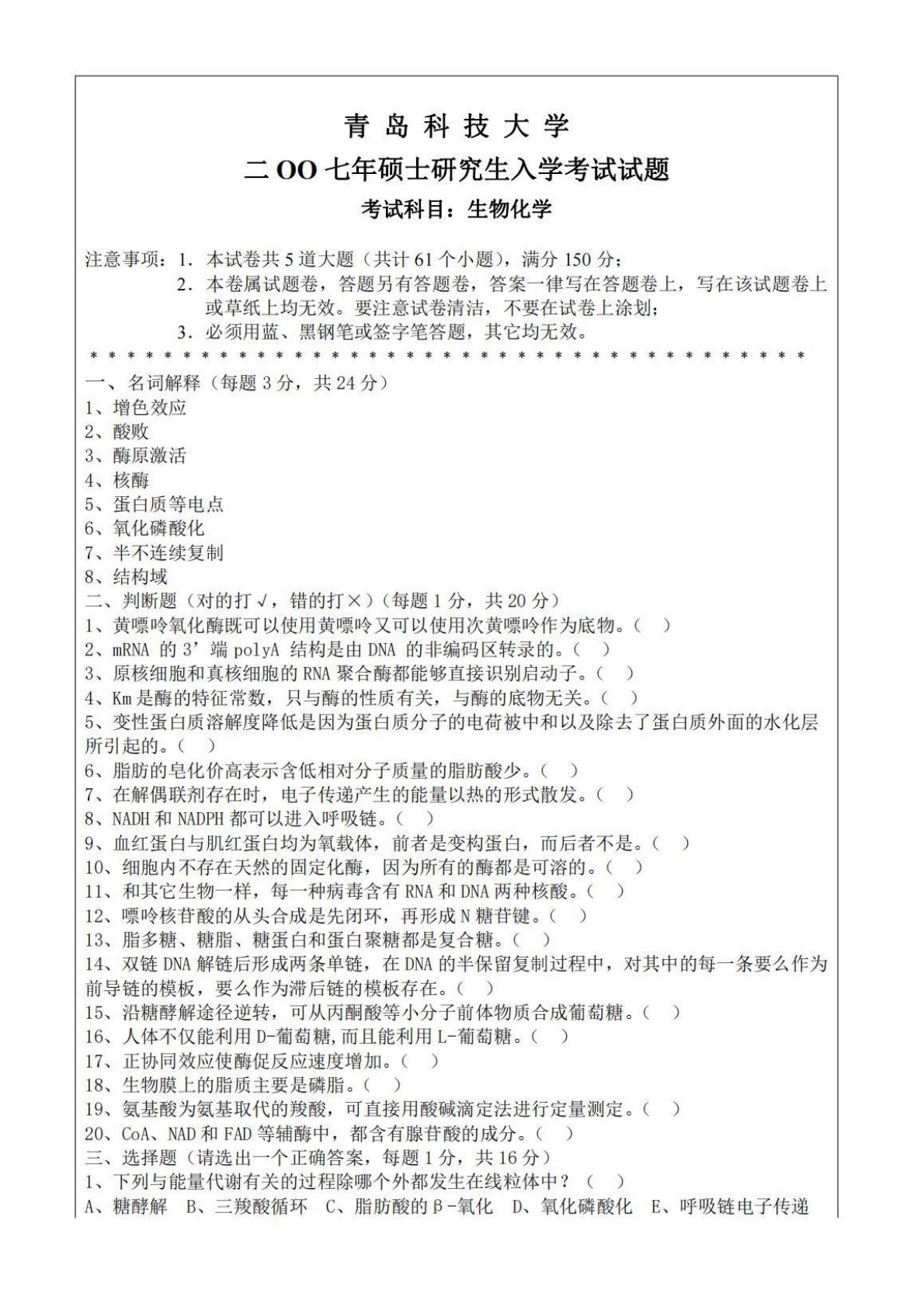 青岛科技大学882生物化学A2007年真题
