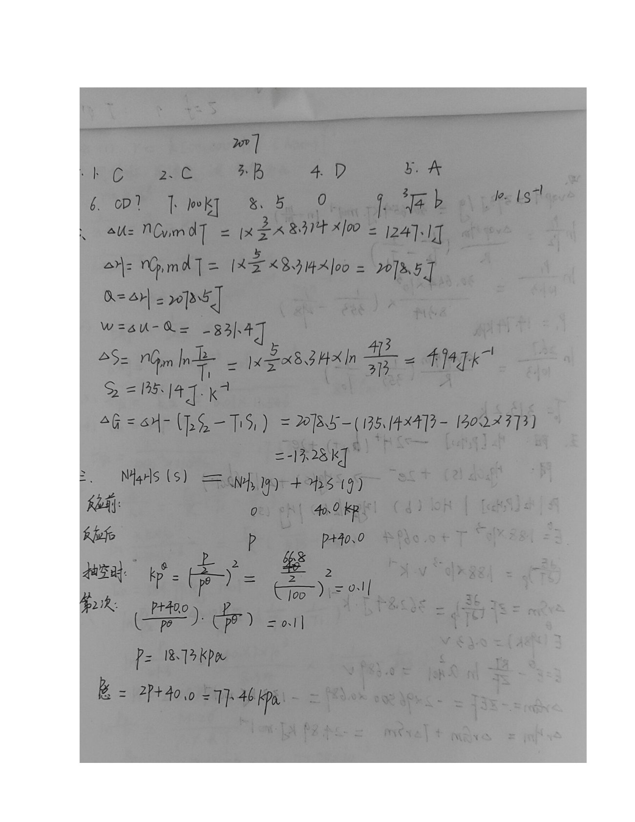 青岛科技大学821物理化学2007年真题答案手写版