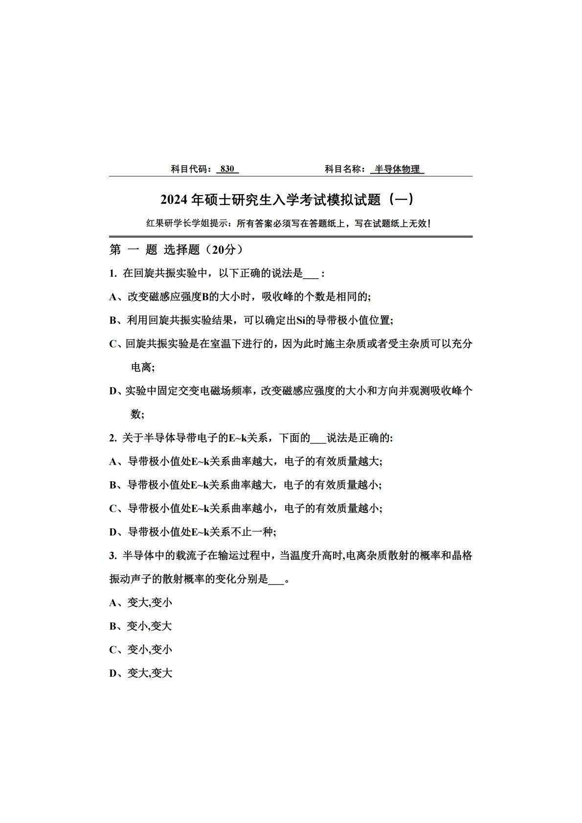 山东大学830半导体物理2024模拟题_