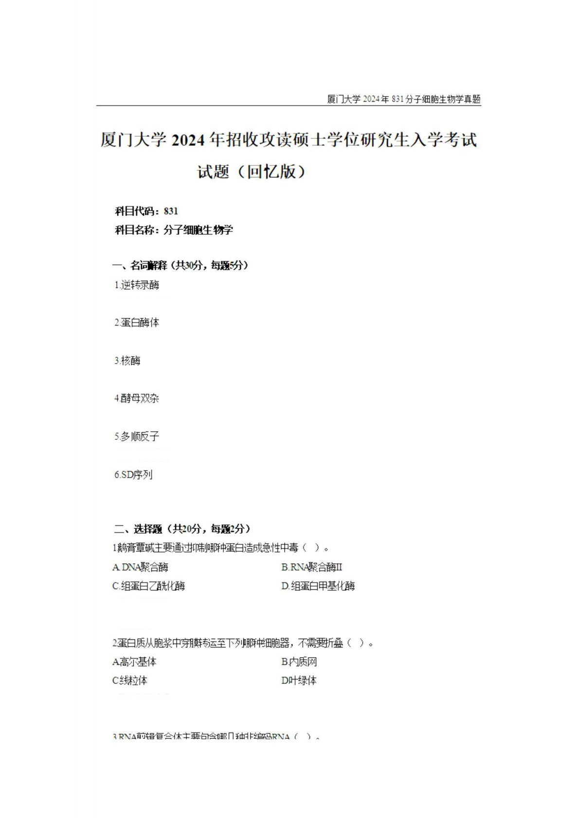 厦门大学831分子细胞生物学2024年真题