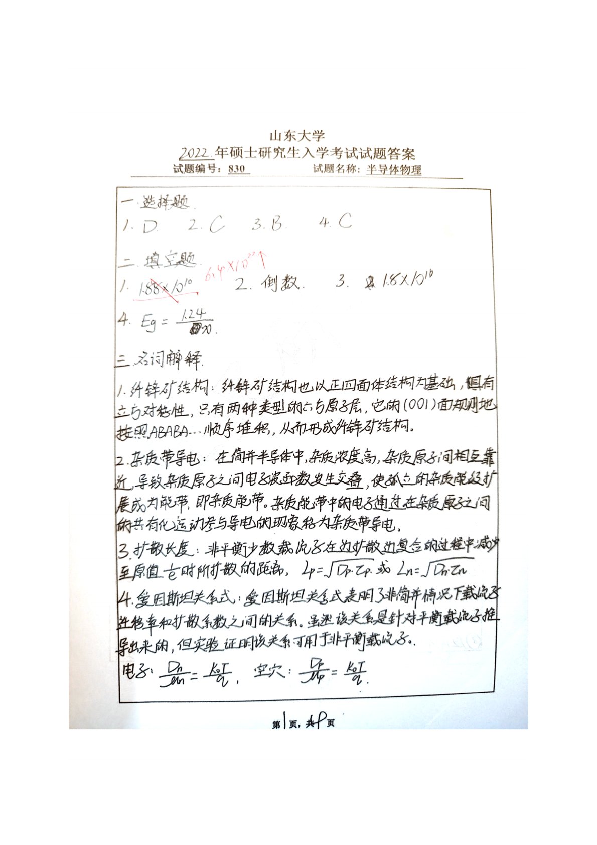 山东大学830半导体物理2022年真题答案(1)