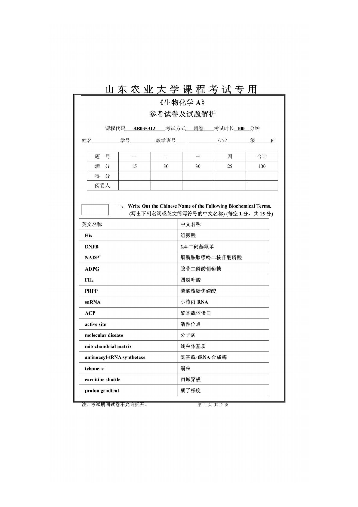 山东农业大学338生物化学山农期末考试试卷