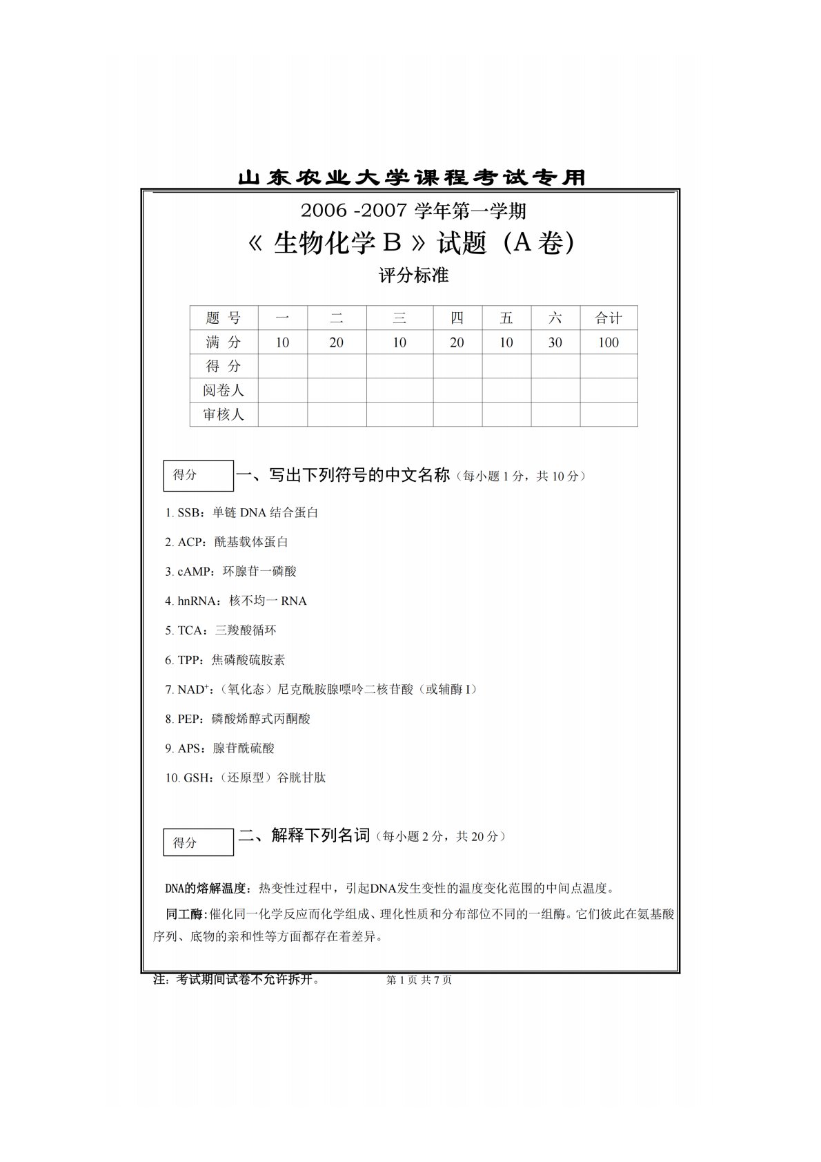 山东农业大学338生物化学06-07生物化学第一学期A卷