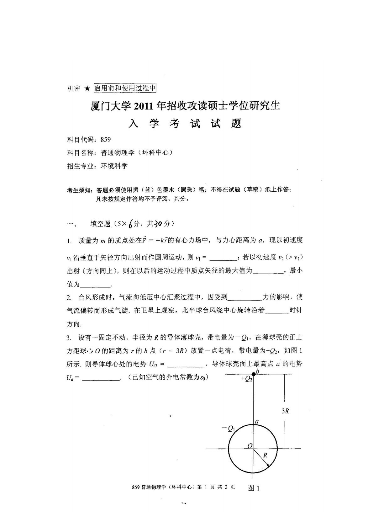 厦门大学850普通物理学(含热、力、光、电)2011年真题1