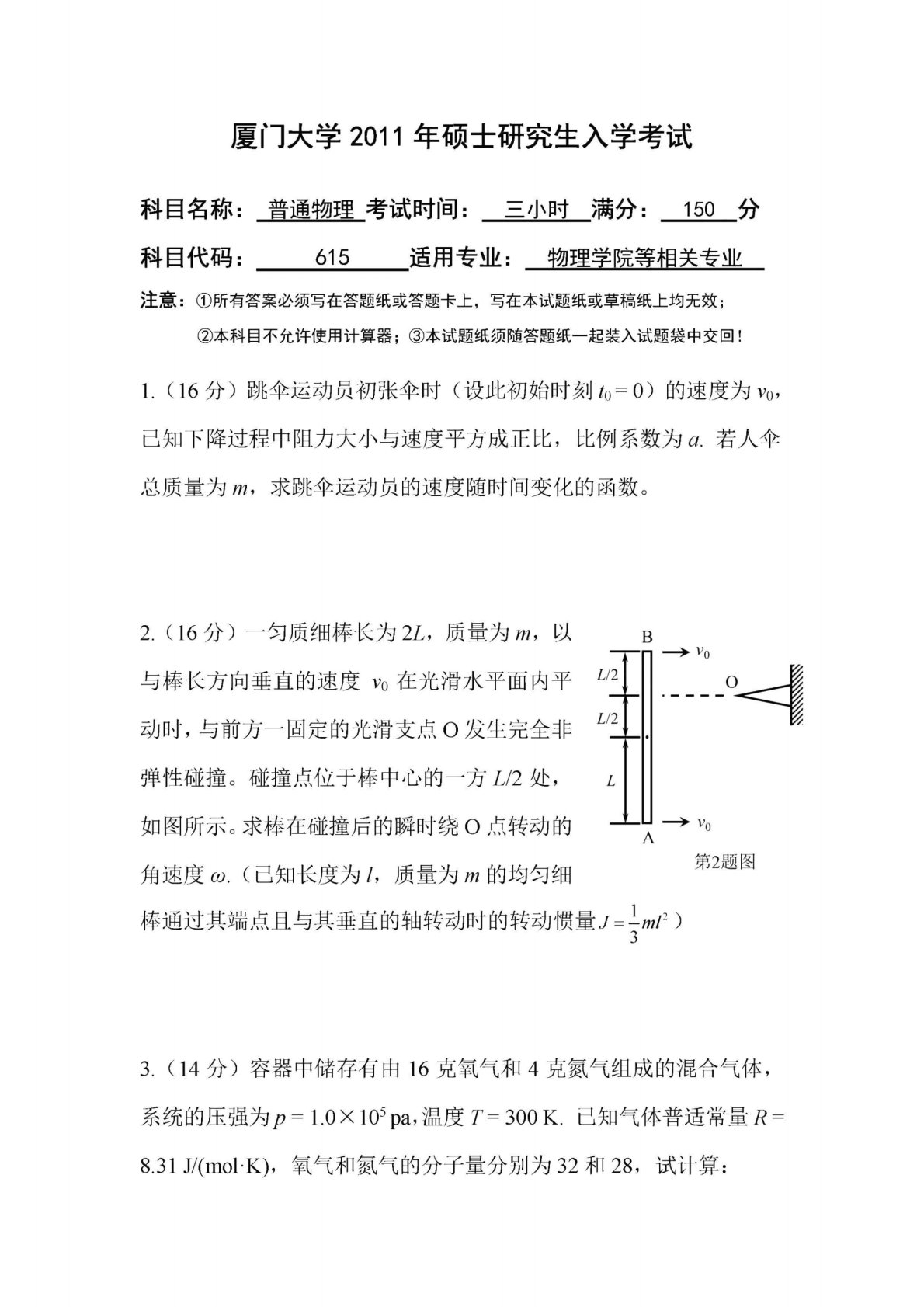 厦门大学850普通物理学(含热、力、光、电)2011年真题