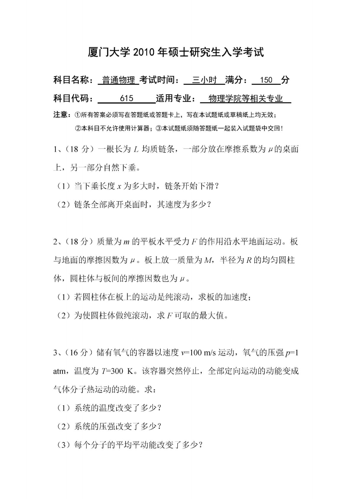 厦门大学850普通物理学(含热、力、光、电)2010年真题