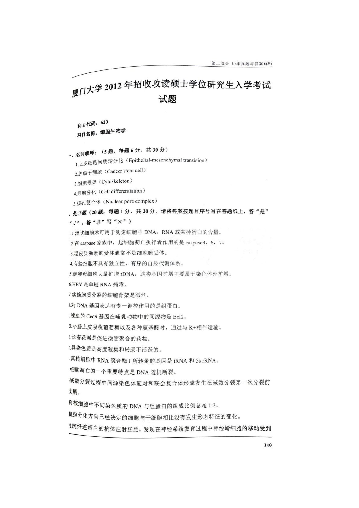 厦门大学831分子细胞生物学2012年真题