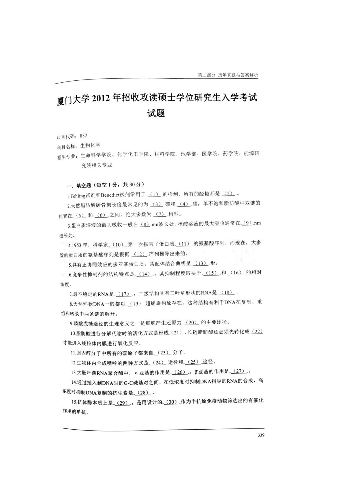 厦门大学338生物化学2012年真题