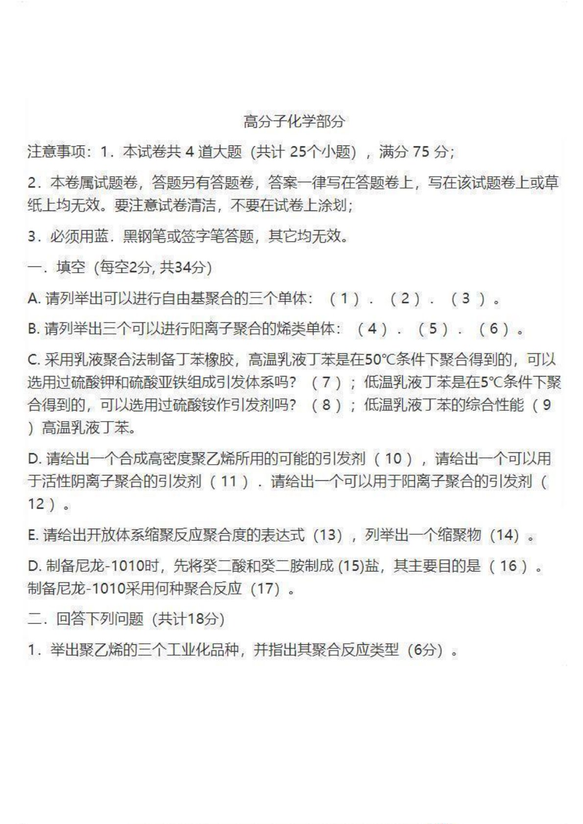 青岛科技大学806高分子化学与物理2010年真题
