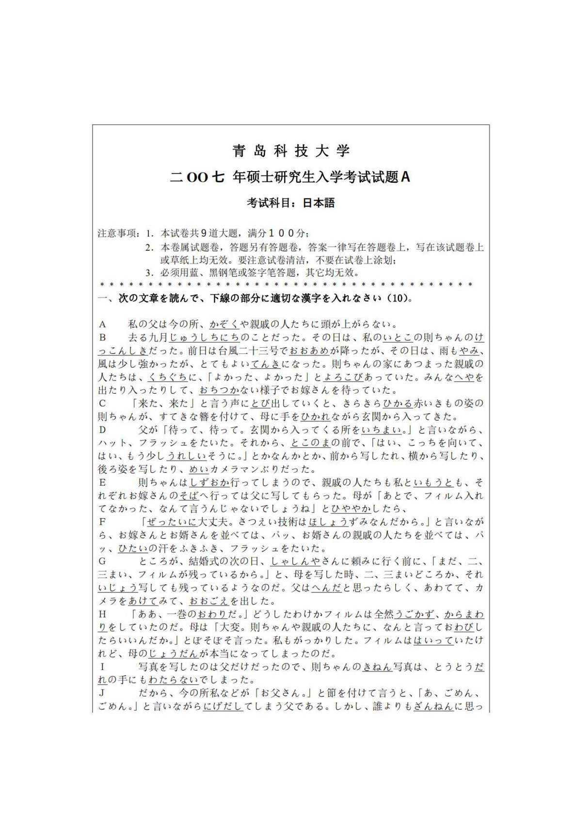 青岛科技大学241日语2007年真题