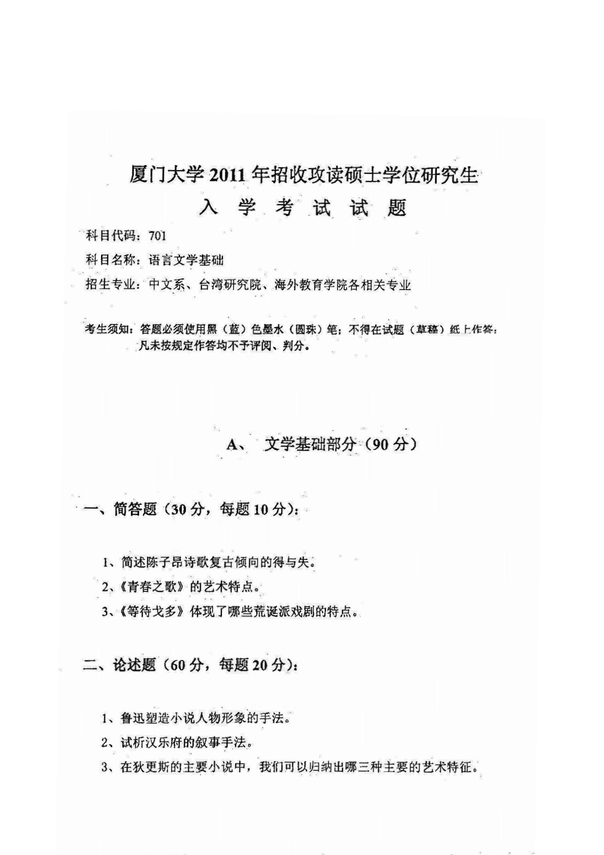 厦门大学701语言文学基础2011年真题