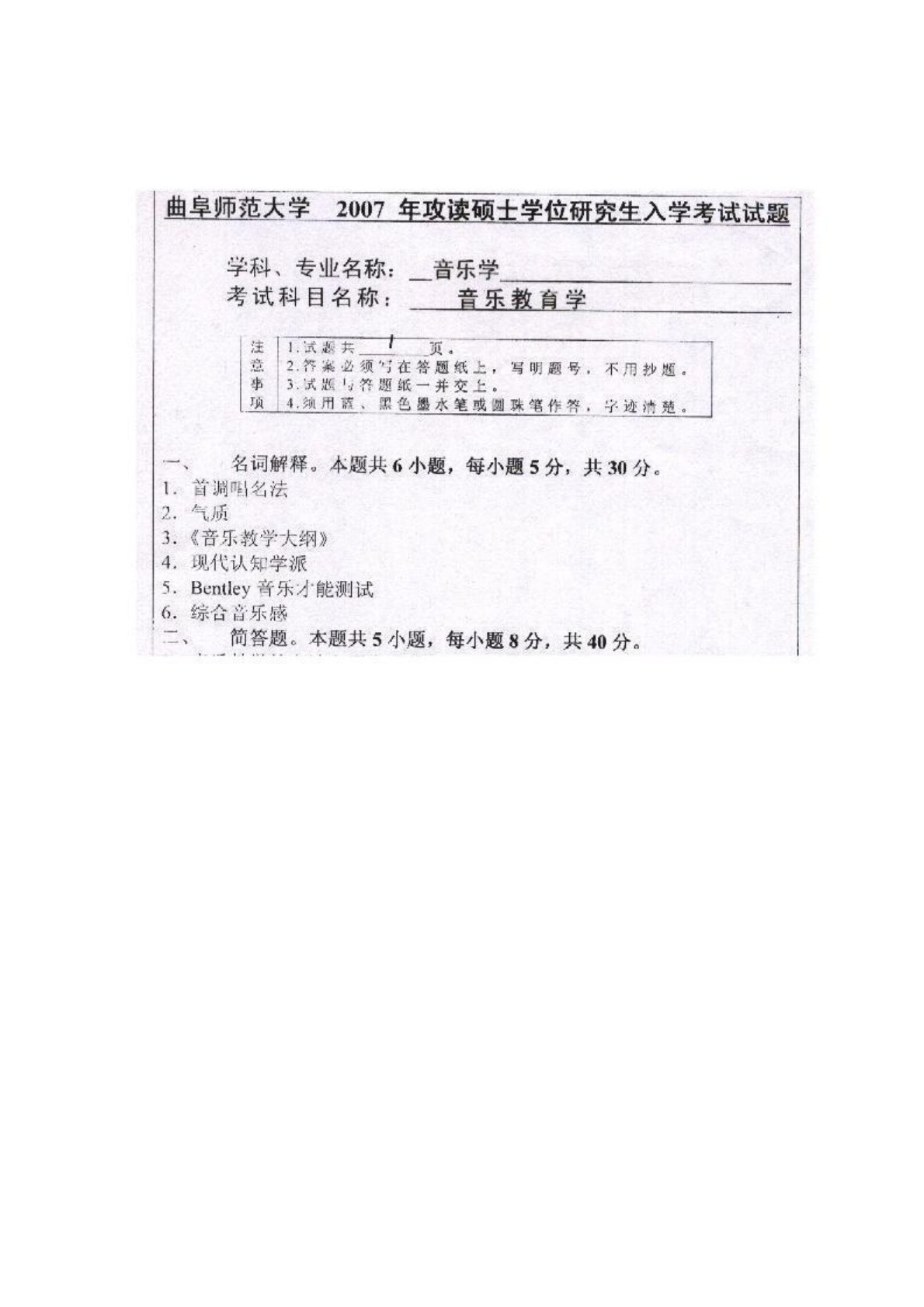 曲阜师范大学813音乐教育学(专硕)2007年真题