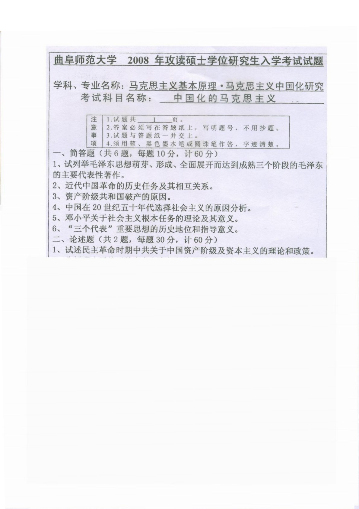 曲阜师范大学804中国化的马克思主义概论(学硕)2008年真题