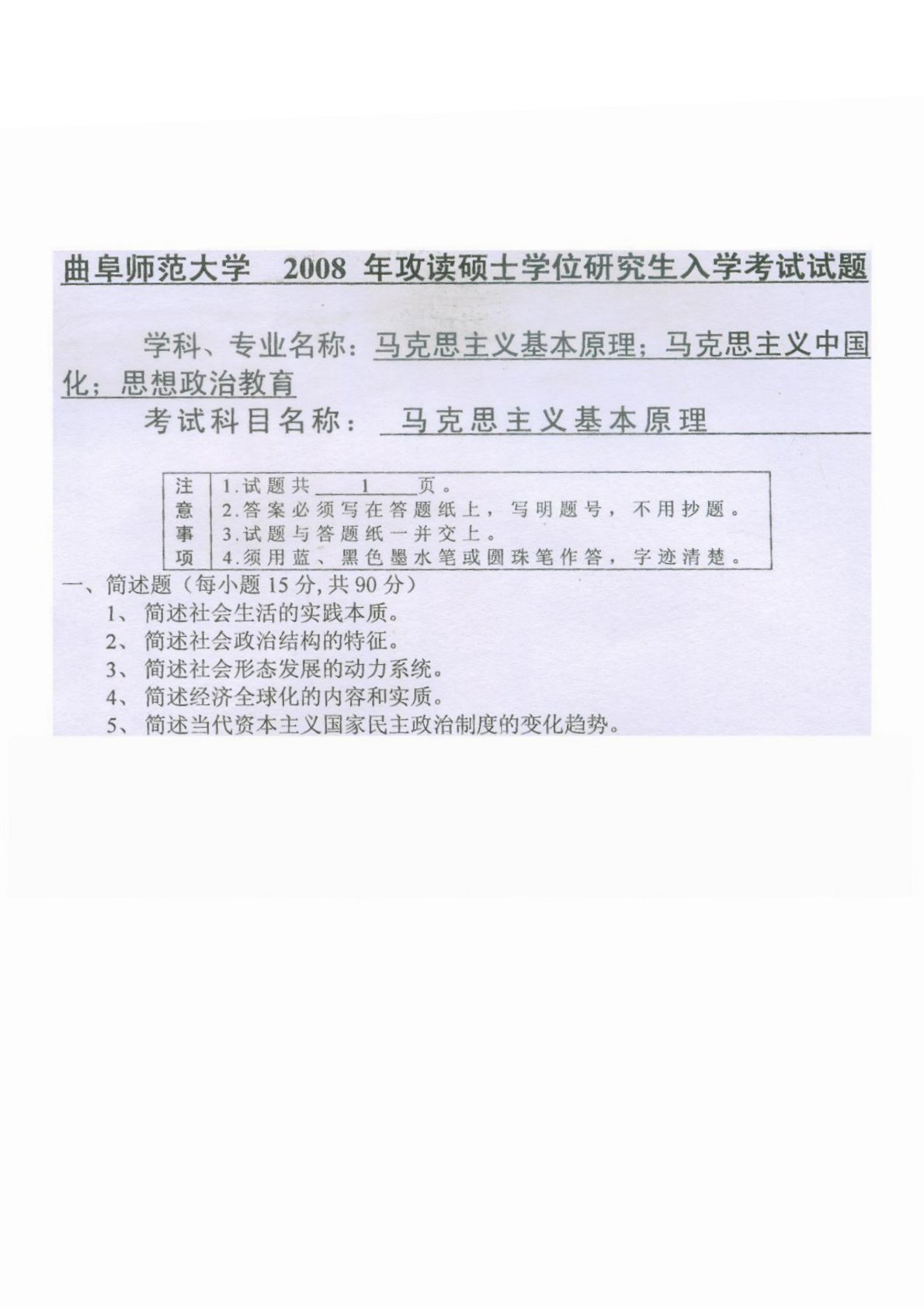 曲阜师范大学704马克思主义基本原理概论(学硕)2008年真题
