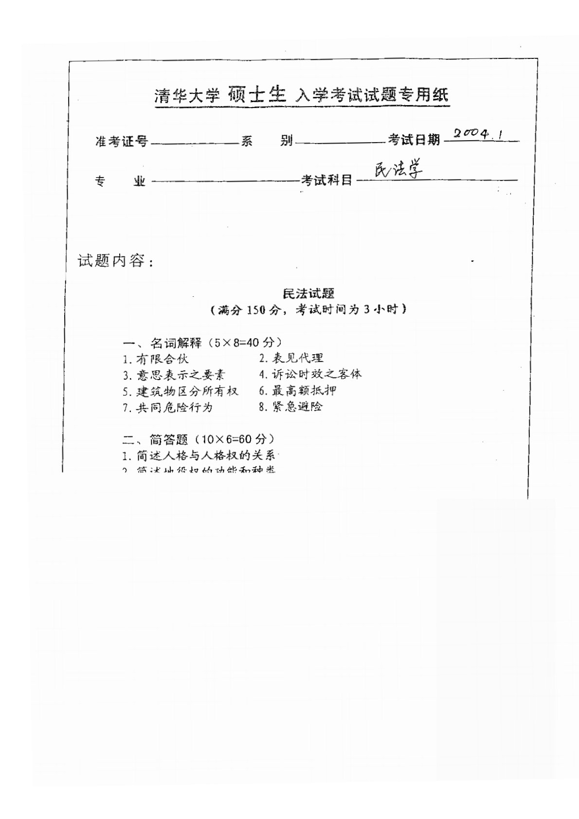 清华大学978专业综合卷三(含民法学、商法学)2004年真题