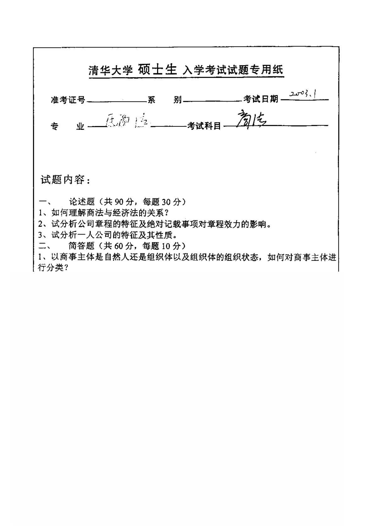 清华大学978专业综合卷三(含民法学、商法学)2003年真题1