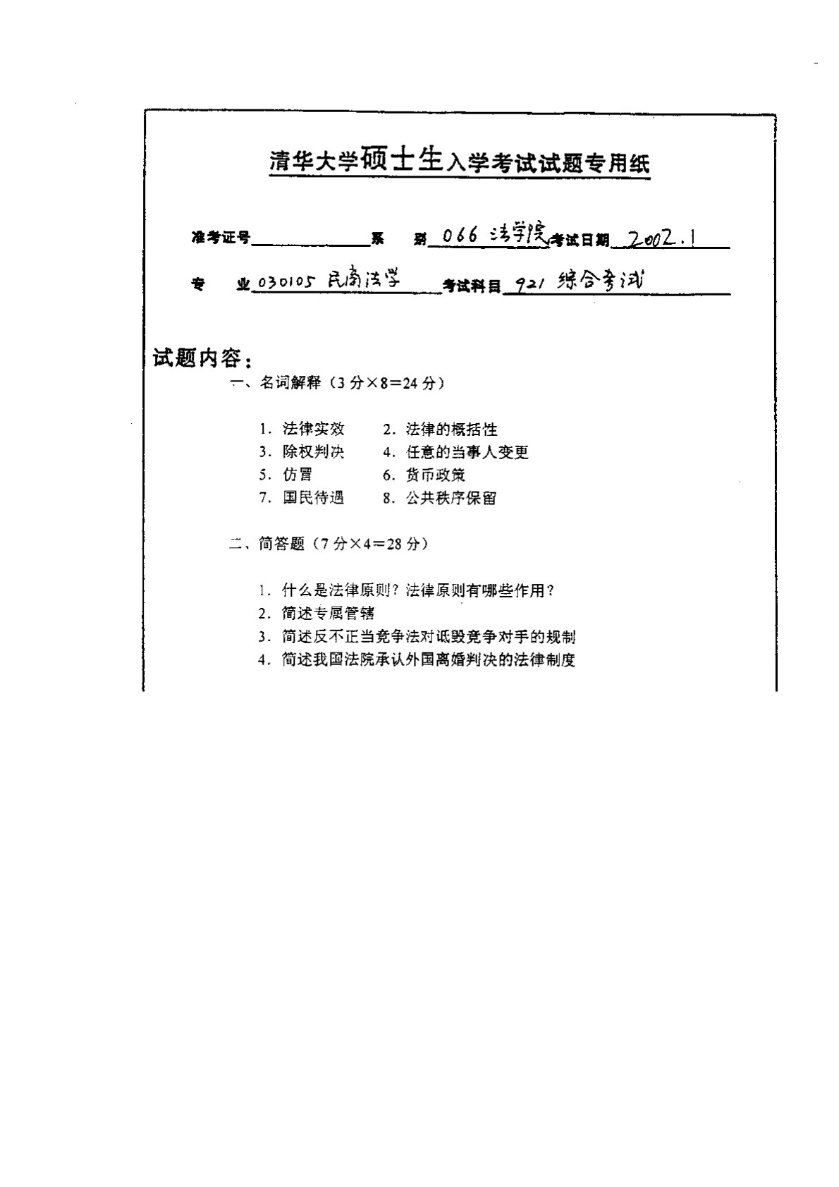 清华大学978专业综合卷三(含民法学、商法学)2002年真题1