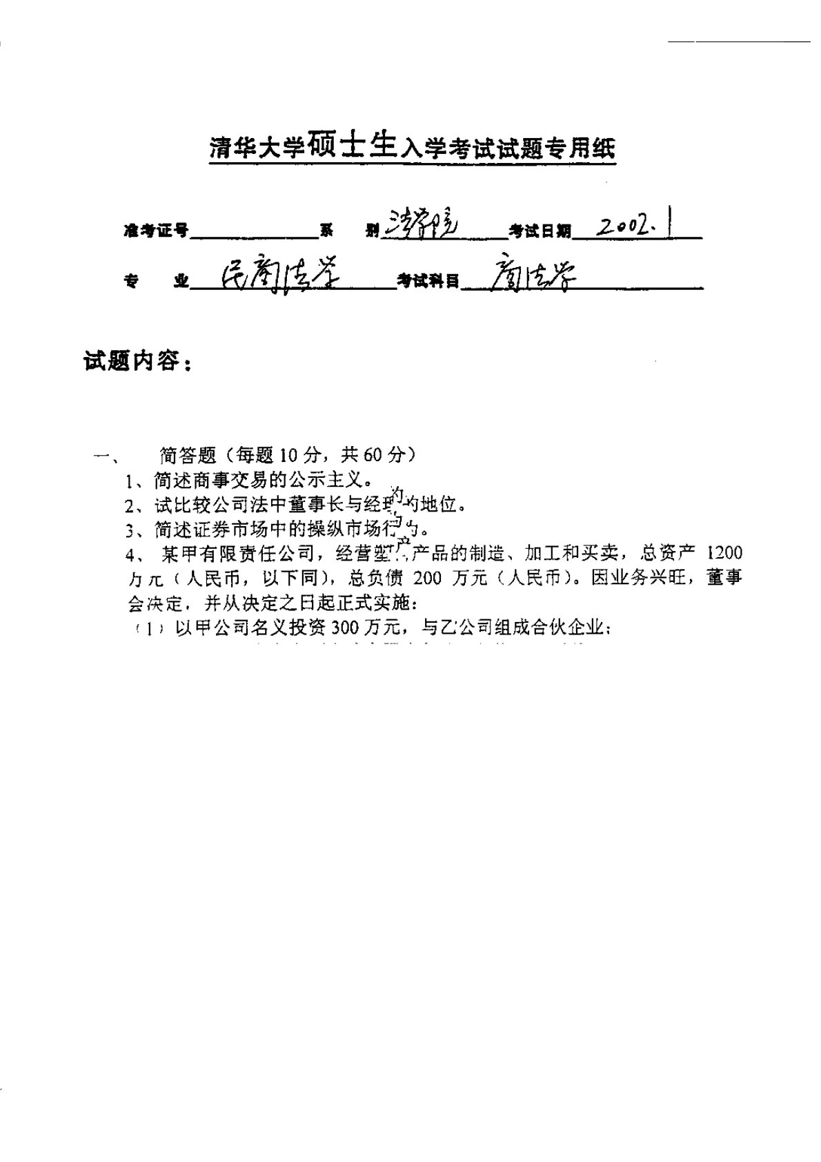 清华大学978专业综合卷三(含民法学、商法学)2002年真题
