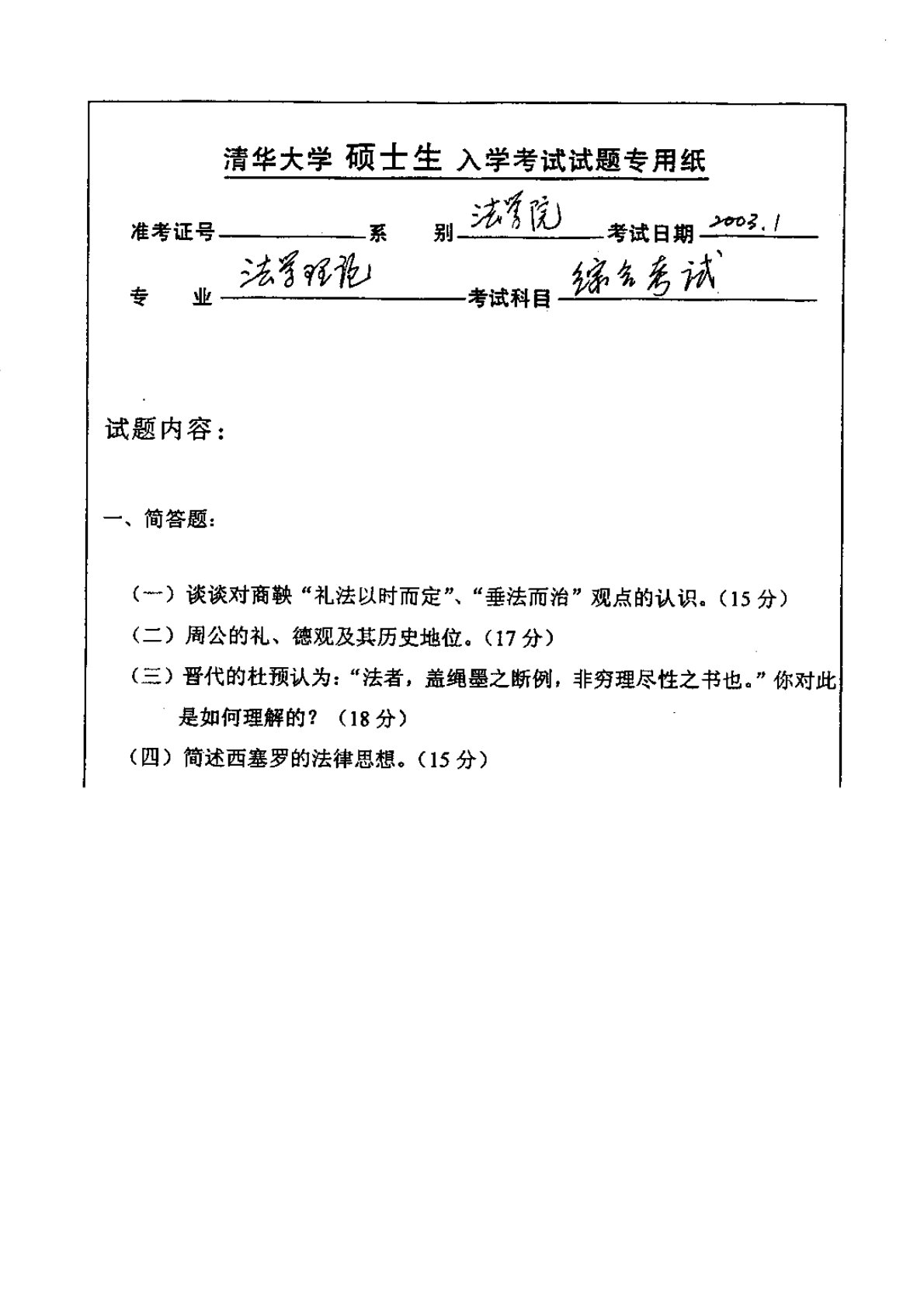 清华大学679法学综合卷(含法理学、宪法学)2003年真题