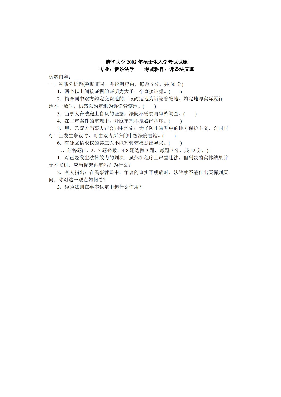 清华大学2002年硕士生入学考试试题专业:诉讼法学考试科目:诉讼法原理试题内容:一、判断分析题(判断正误,并说明理由,每题5分,共30分)1.两个以上间接证据的证明力大于一个直接证据。()2.销合同中双方约定交货地的,该约定地为诉讼管辖地。约定地与实际履行地不一致时,仍然以约定地为诉讼管辖地。()3.当事人在法庭上自认的证据,法院不需要再审核调查。()4.在二审案件的审理中,开庭审理不是必经程序。()5.甲、乙双方当事人在合同中约定:为了防止审判中的地方保护主义,合同履行一旦发生争议时,可由双方所在的中级法院管辖。()6.有独立请求权的第三人不能对管辖权提出异议。()二、问答题(1、2、3题必...