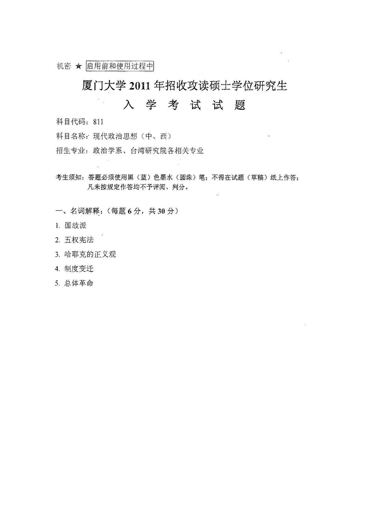 厦门大学811现代政治思想(中、西)2011年真题