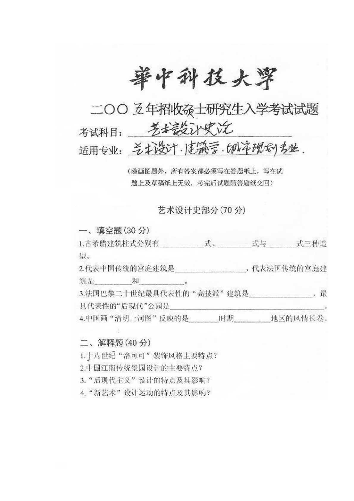 华中科技大学629艺术设计史论2005年真题