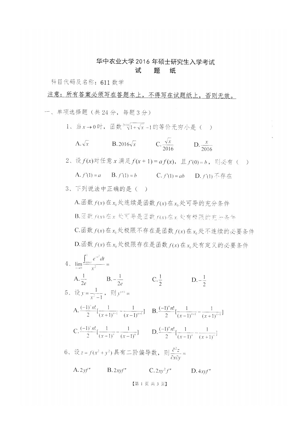 华中农业大学621公共管理学2016年数学考研真题