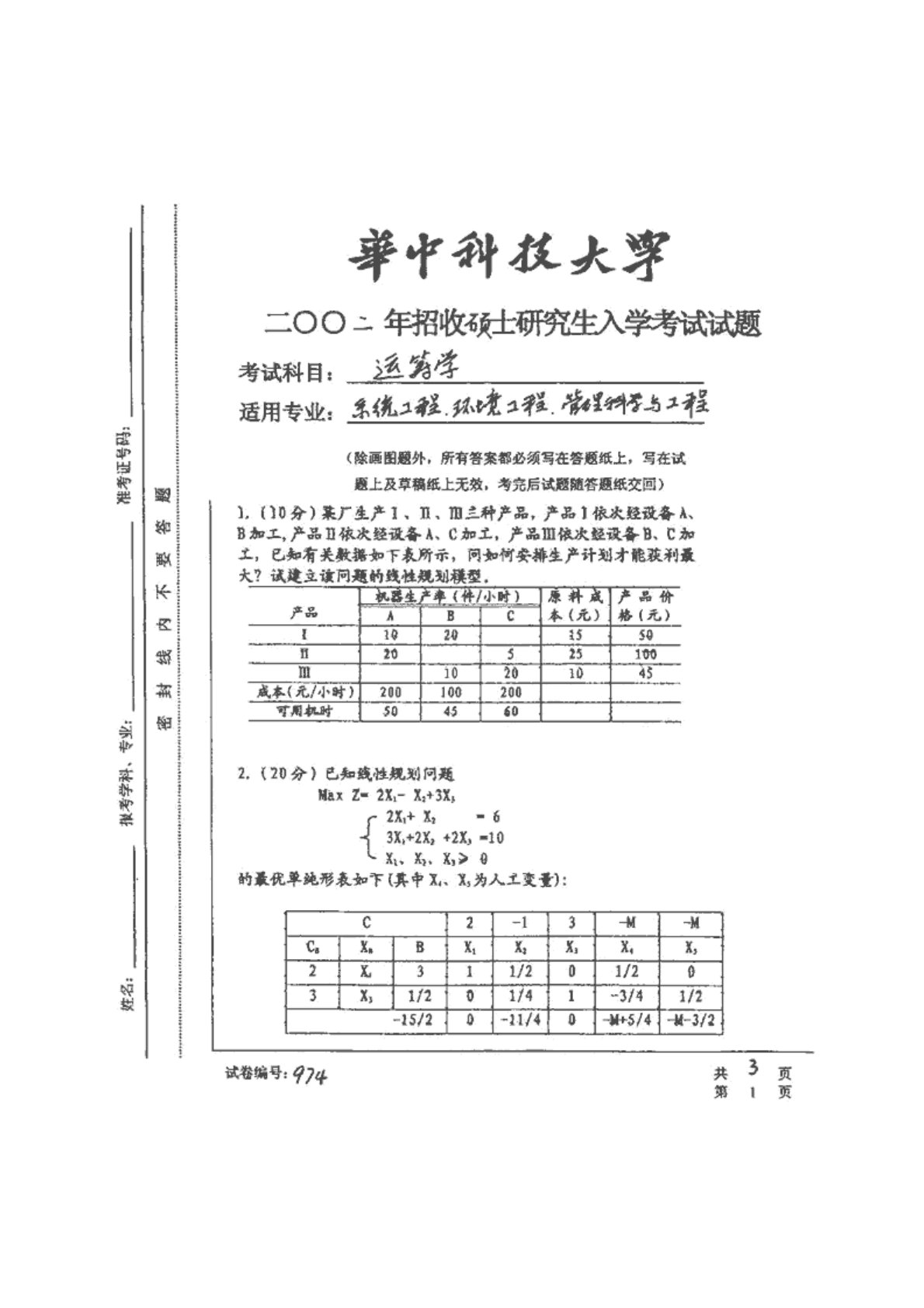 华中科技大学851运筹学(一)2002年真题