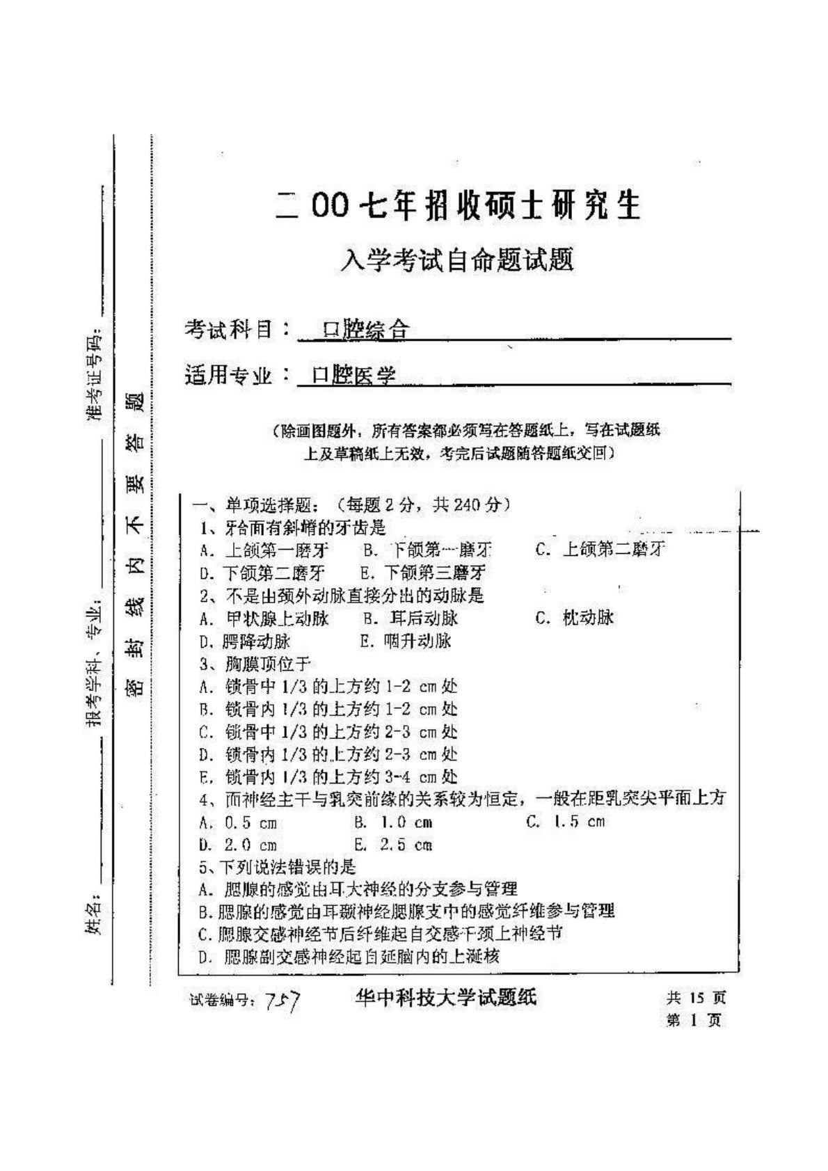 华中科技大学352口腔综合2007年真题