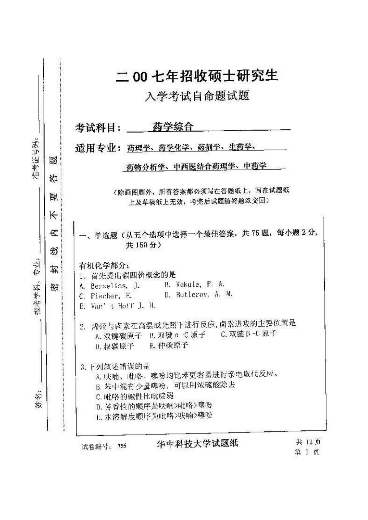 华中科技大学349药学综合2007年真题