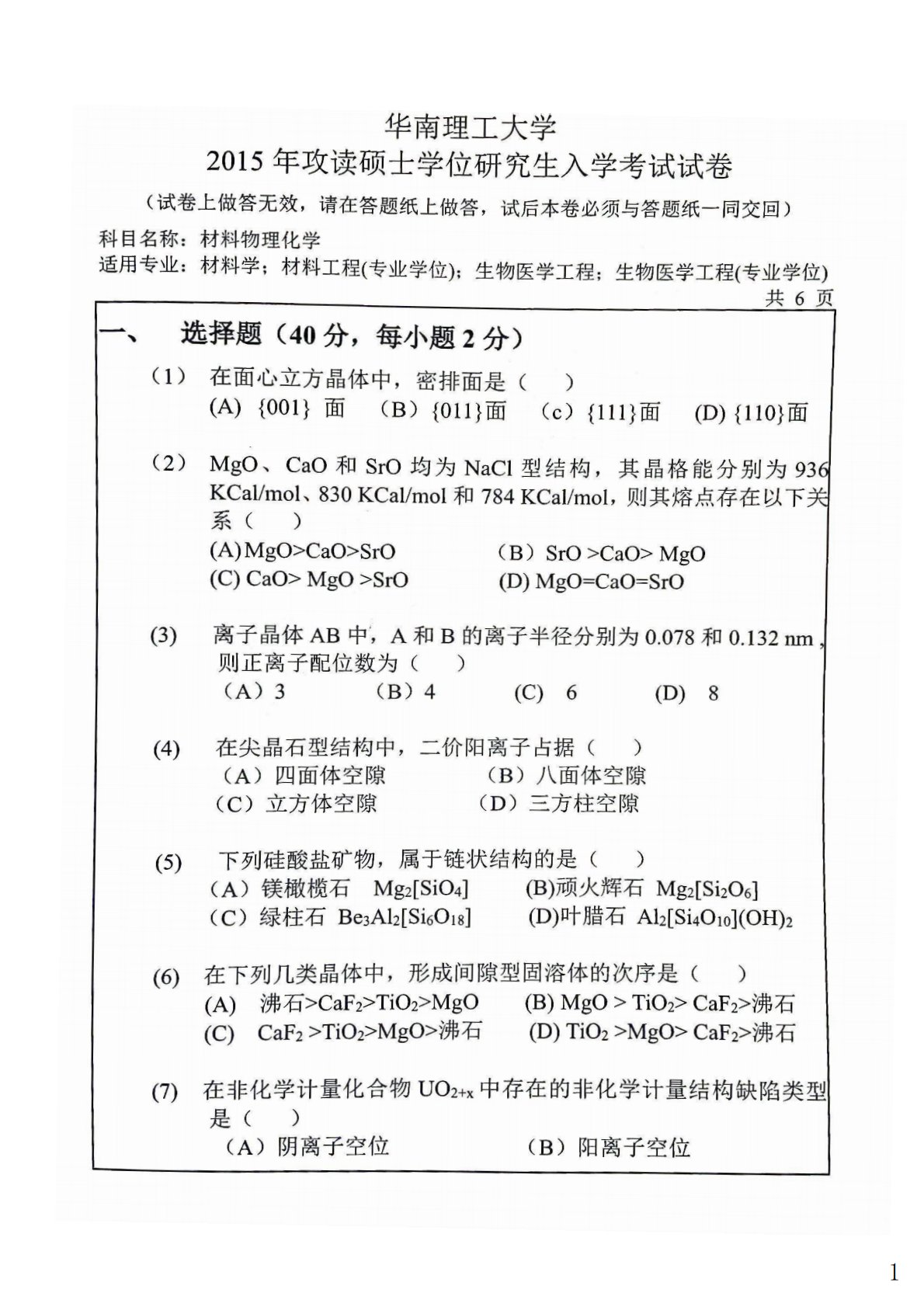 华南理工大学818材料物理化学2015年真题