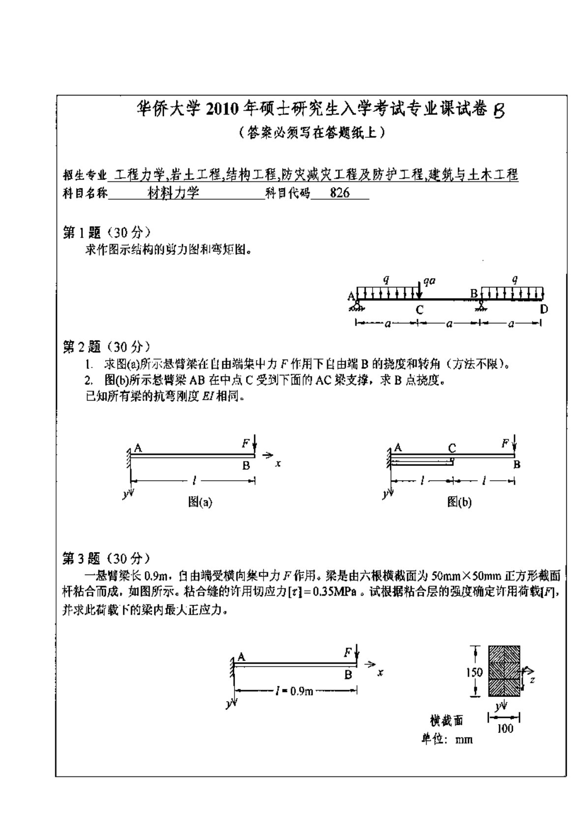 华侨大学832材料力学(土木学院)2010年真题
